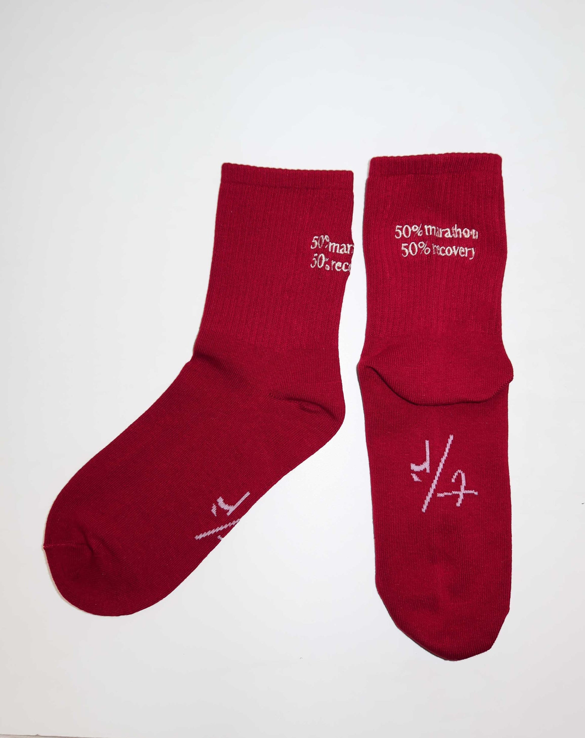 Un paio di calze in cotone, bordeaux, realizzate in esclusiva per questa collaborazione. La scritta ricamata “50% marathon, 50% recovery” racconta perfettamente la filosofia del kit: equilibrio tra performance e recupero. Un messaggio da indossare, dentro e fuori dall’allenamento.